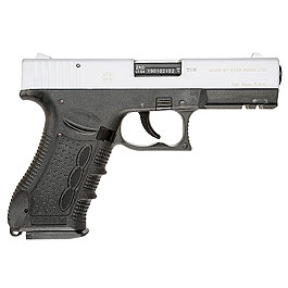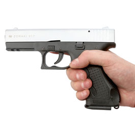 Zoraki Waffen überzeugen im Allgemeinen mit ihrer Zuverlässigkeit, so auch die Zoraki 917. Mit ihrem relativ schweren Gewicht und durch das ergonomisch geformte Polymergriffstück hat die Zoraki 917 Schreckschusspistole eine hervorragende Handhabung. Hier in der Ausführung matt chrom.