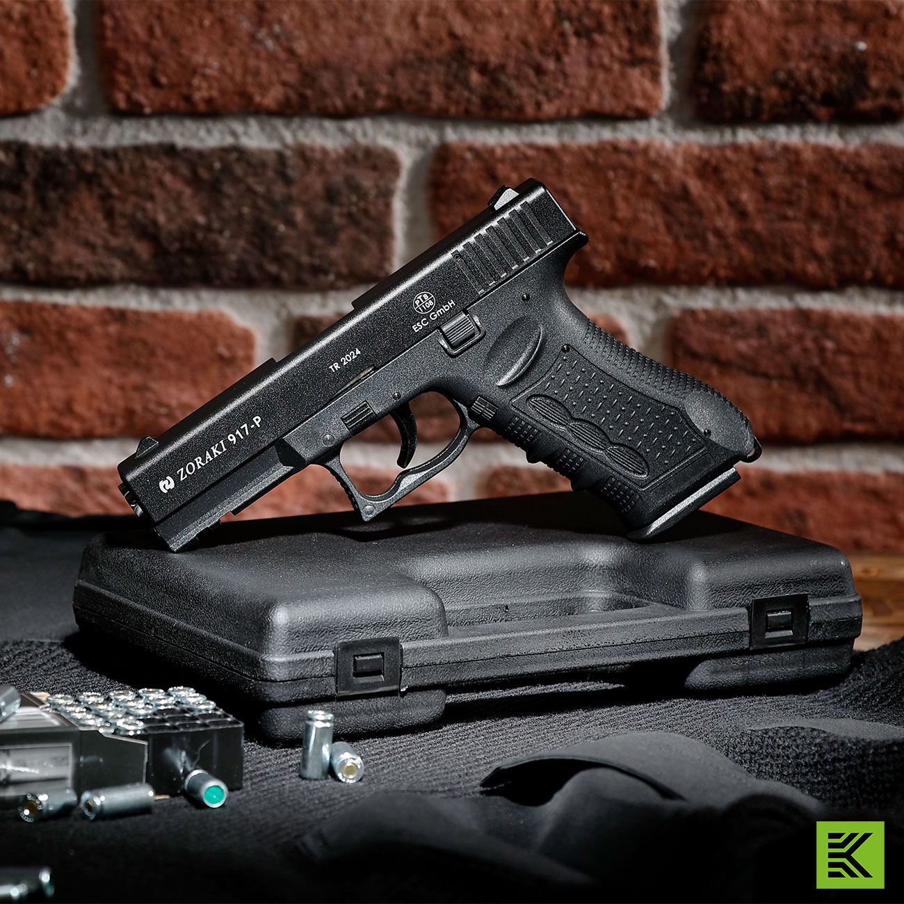 Geliefert wird die Zoraki 917 im Kal. 9mm P.A.K. inklusive einem Abschussbecher zum Verschießen von Signaleffekten, einer Reinigungsbürste und einem Kunststoff-Koffer.